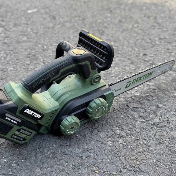 Máy được thiết kế tay cầm giống như cưa xăng, mang lại cảm giác thoải mái khi sử dụng, hỗ trợ cưa cây đứng và cây nằm
