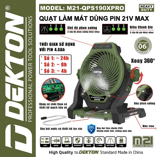 Máy quạt dùng pin dekton m21-qps190xpro có phun sương