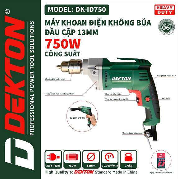 – Phụ kiện kèm theo gồm: 1 Cặp chổi than, 1 tay cầm phụ, 1 khóa vặn mũi khoan, phiếu bảo hành